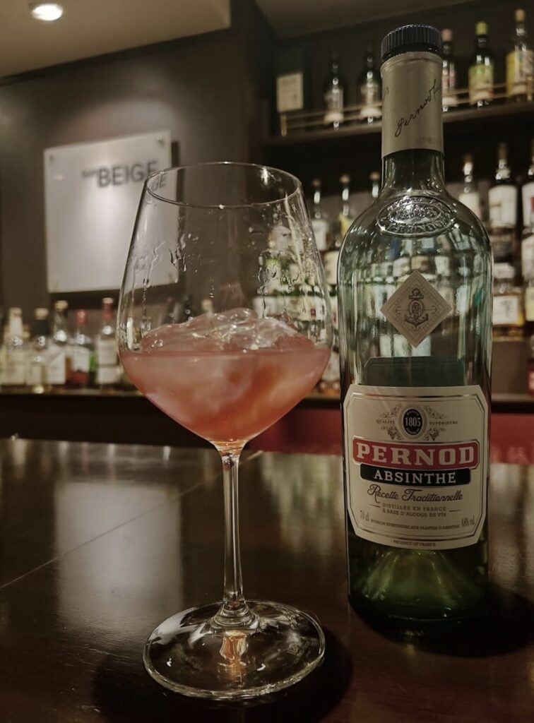 本カクテルはアブサン(香草系リキュール)とフルーツリキュールを使用。